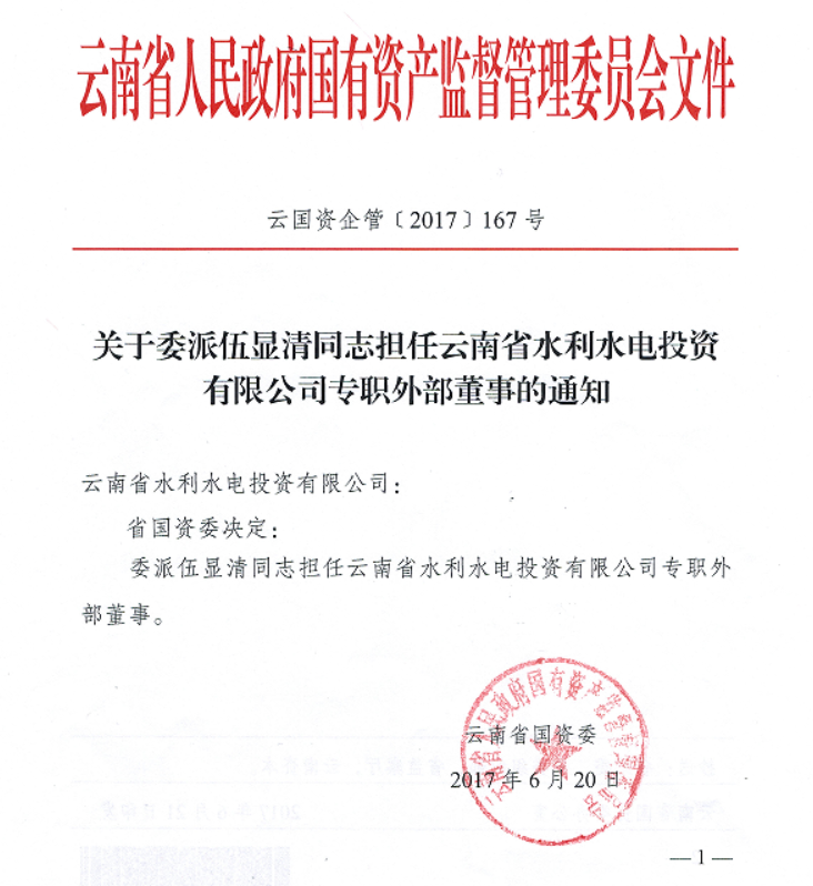 云南省國(guó)資委關(guān)于委派伍顯清同志擔(dān)任公司專職外部董事的通知